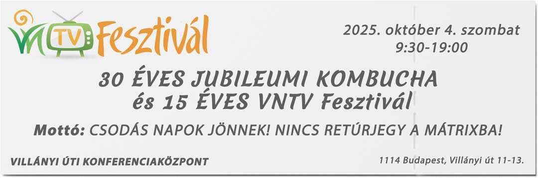 Jegyvásárlás Ünnepelj velünk 2025. október 4-én a 30 éves Kombucha és 15 éves VNTV születésnapi, jubileumi rendezvényünkön! Mottó: CSODÁS NAPOK JÖNNEK! NINCS RETÚRJEGY A MÁTRIXBA! 2025. október 4. szombat VILLÁNYI ÚTI KONFERENCIAKÖZPONT Jegyárak Vegye meg a jegyét kedvezményesen, elővételben!A jegy a rendezvény teljes ideje alatt korlátlan részvételi lehetőséget biztosít az előadásokra is! Elővételi jegyvásárlás: 2025. […]